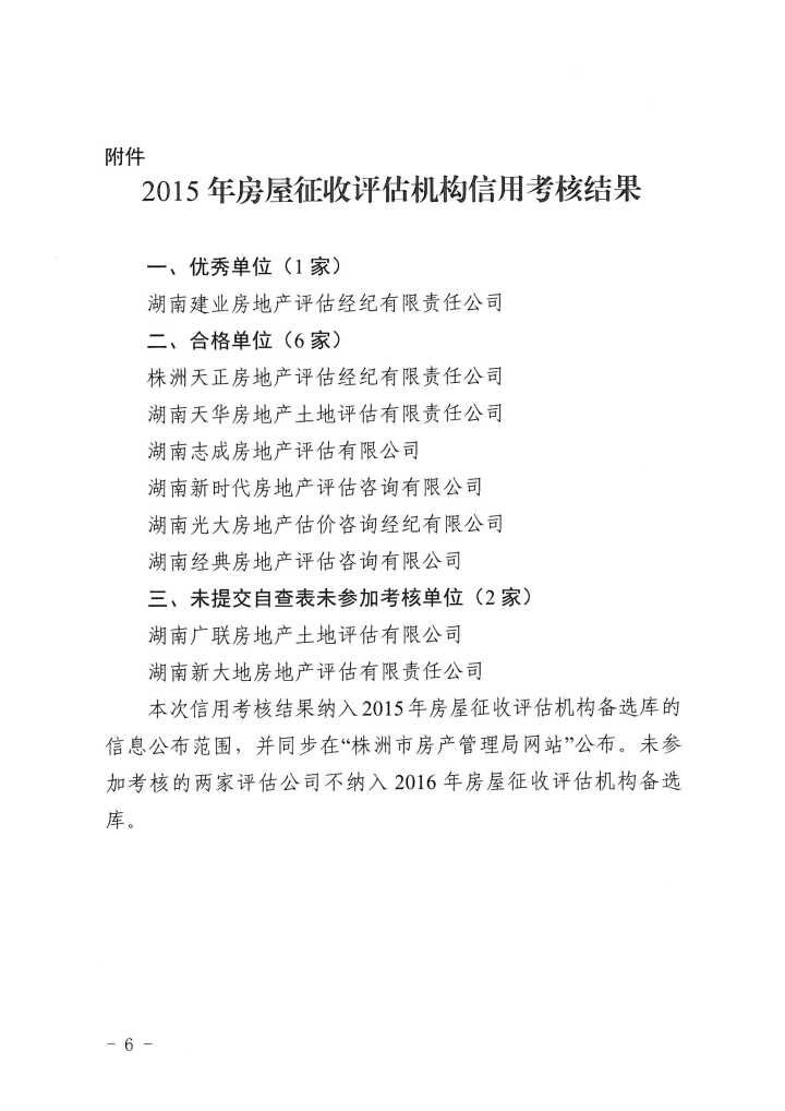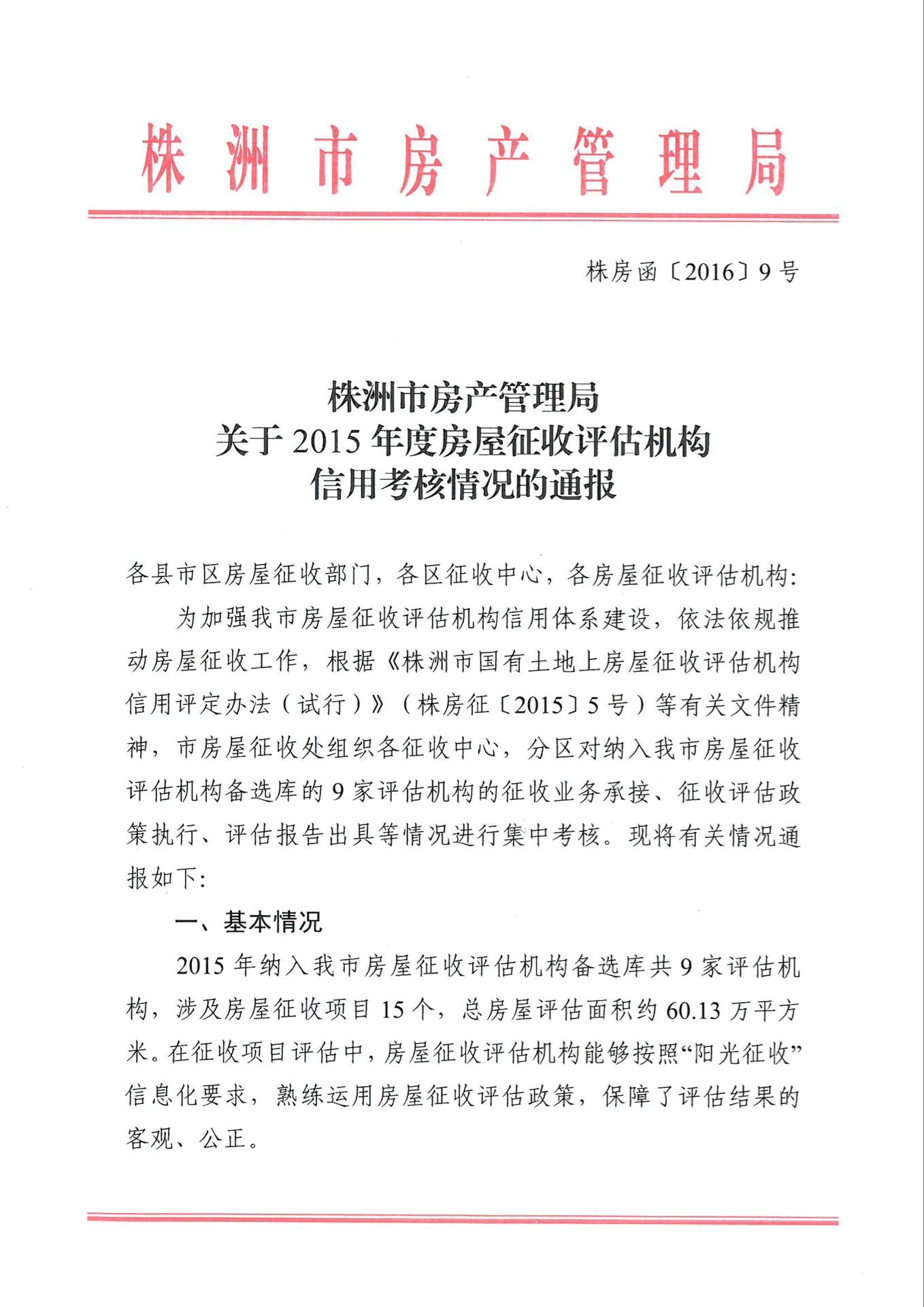 株洲市房產管理局關于2015年度房屋征收評估機構信用考核情況的通報